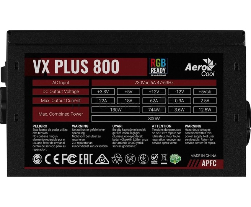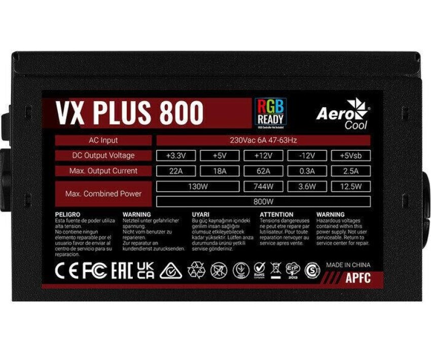 Блок питания AEROCOOL Блок питания 800W VX PLUS 800W (ATX, 20+4 pin, 120mm fan, PCI-E 6+2Px4, 6xSATA) (VX PLUS 800 RGB)