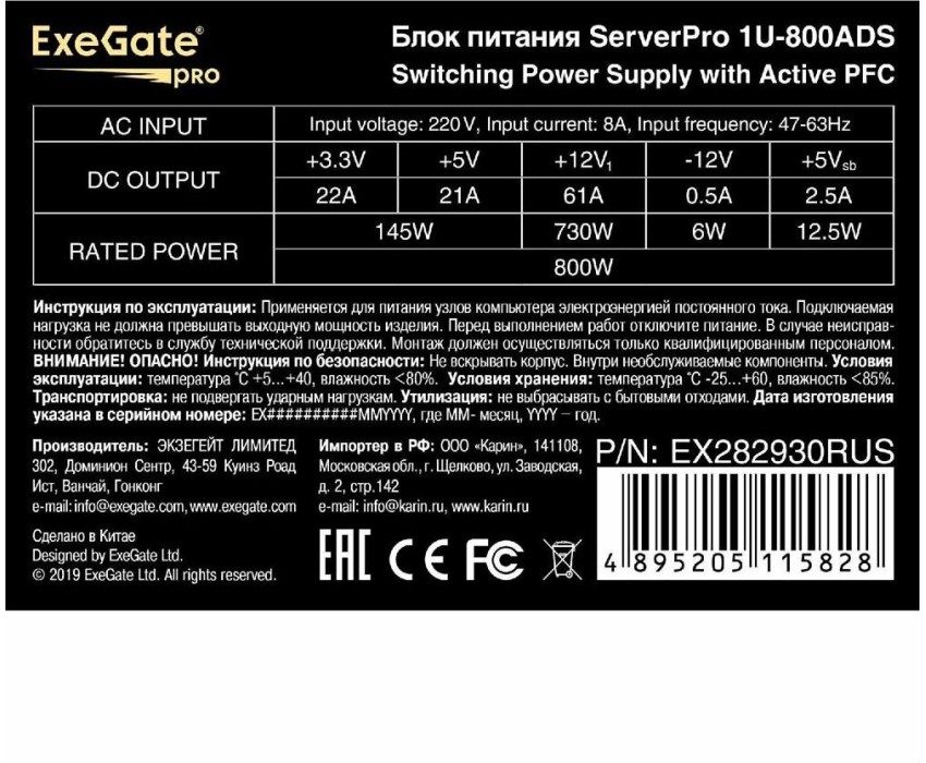 Блок питания Exegate EX282930RUS Серверный БП 800W ExeGate APFC, унив. для 1U, 24pin,2x(4+4)pin,5xSATA,4xIDE