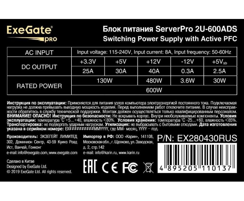Exegate EX280430RUS Серверный БП 600W ExeGate APFC, унив. для 2U, 24pin, 2*8pin, 5xSATA, 3xIDE