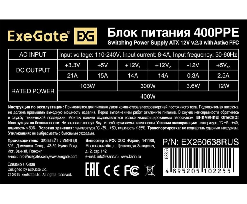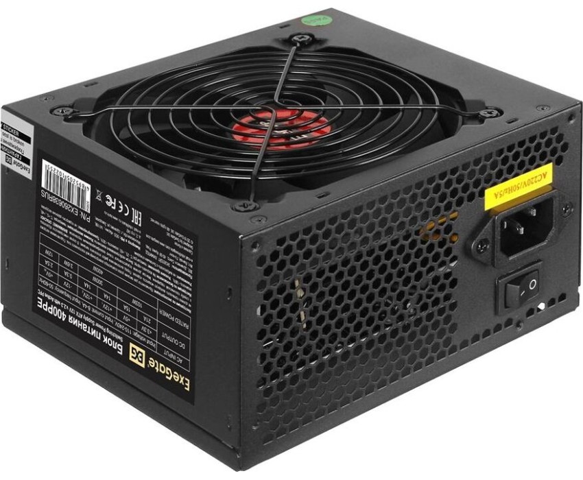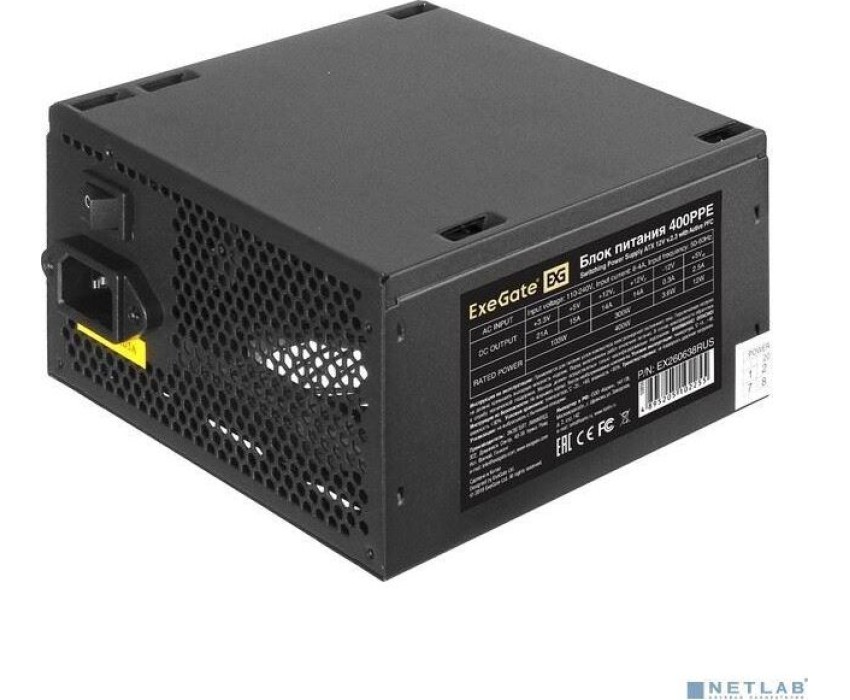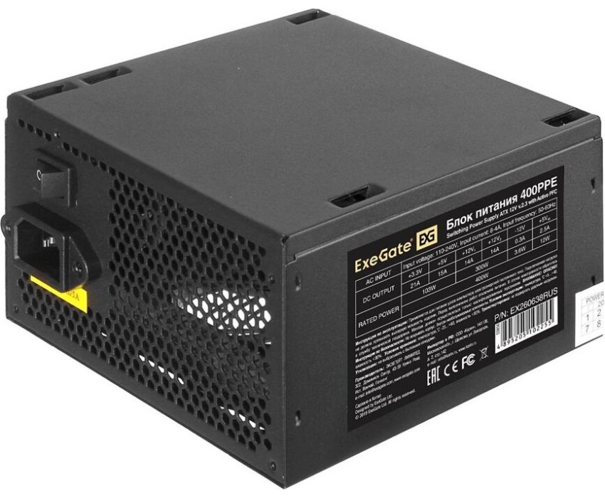 Exegate EX260638RUS-PC Блок питания 400W ExeGate 400PPE (ATX, APFC, PC, КПД 80% (80 PLUS), 12cm fan, 24pin, (4+4)pin, PCIe, 5xSATA, 3xIDE, black, кабель 220V в комплекте)
