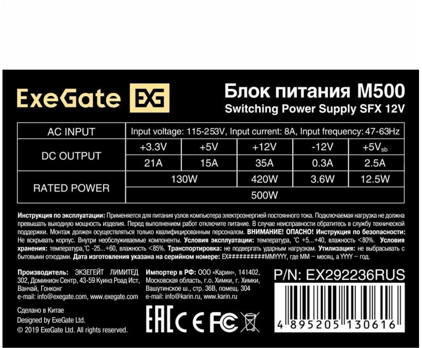 Блок питания Exegate EX292236RUS Блок питания 500W ExeGate M500 (SFX, APFC, КПД 87% (80 PLUS Silver), 8cm fan, 24pin, 4+4pin, 3xSATA, 2xIDE, FDD, black)