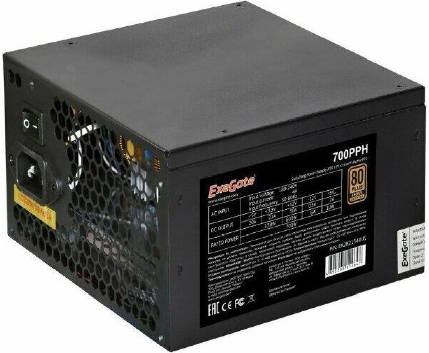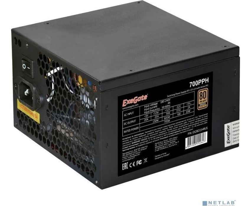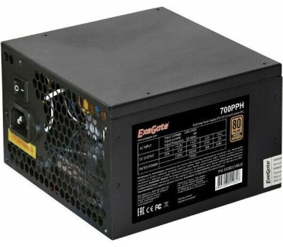 Блок питания Exegate EX282154RUS Блок питания 700W ExeGate 80 PLUS® Bronze 700PPH (ATX, APFC, КПД 89% (80 PLUS Bronze), 12cm fan, 24pin, (4+4)pin, PCIe, 5xSATA, 3xIDE, black, Color Box)