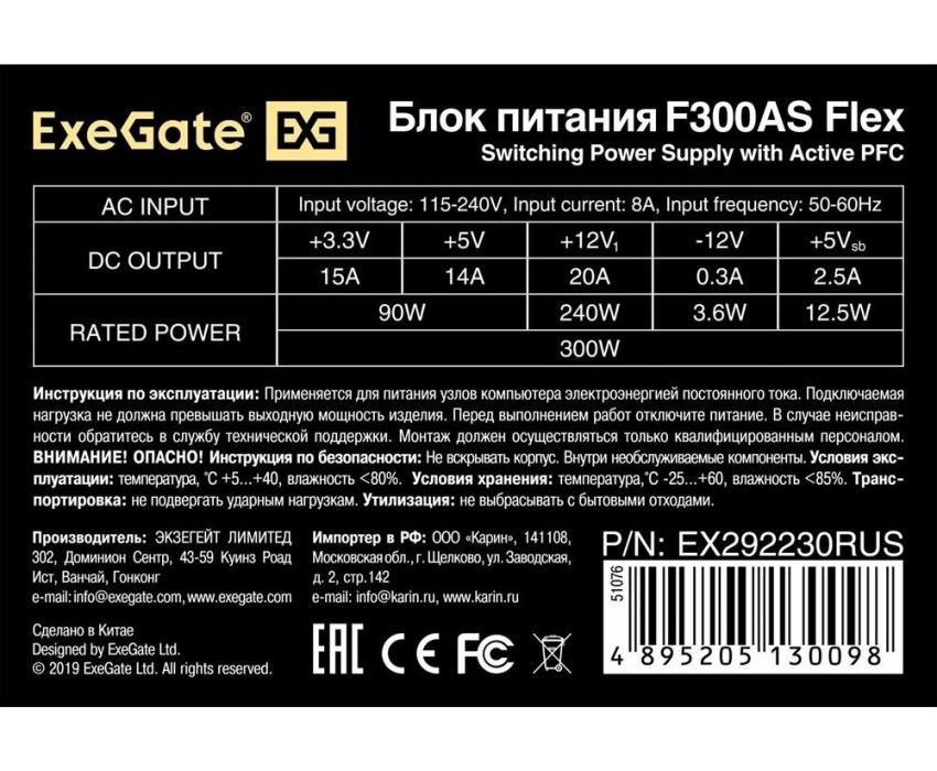 Блок питания Exegate EX292230RUS Блок питания 300W ExeGate F300AS (Flex ATX, for ITX case, APFC, КПД 80% (80 PLUS), 4cm fan, 24pin, 4pin, 3xSATA, 2xIDE)