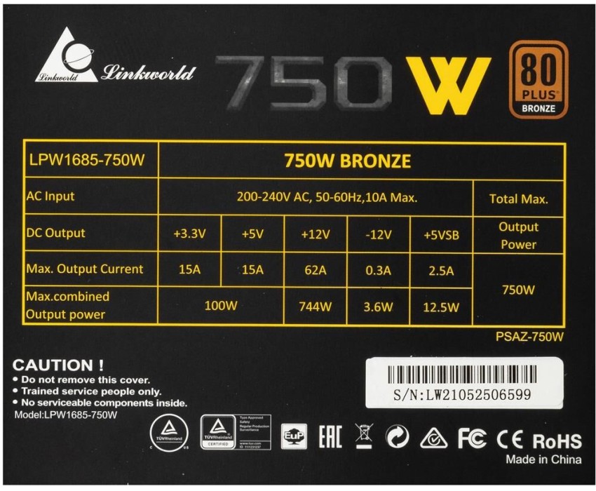 Мощность: 750. Форм-фактор: ATX. Количество вентиляторов: один. Тип поставки: Ret. Цвет: черный. Производительность (КПД): 80. Активный PFC: есть. Сертифицирован в стандарте: 80 PLUS BRONZE. Питание материнской платы: 20+4 pin. Разъемы Peripheral (Molex): 2. Разъемы для FDD: 1. Разъемы SATA: 5. Питание видеокарты: 2х(6+2) pin. Оплетка кабелей: есть. Сетевой кабель: в комплекте. Длина линий питания видеокарты: 500. Версия ATX: 12V v2.52. Габариты упаковки (ед) ДхШхВ: 0.27x0.2x0.11. Вес упаковки (ед): 2.16. Максимальное входное напряжение: 240. Минимальное входное напряжение: 100. Ток по линии -12В: 0.3. Ток по линии +12В: 62. Ток по линии +3.3В: 15. Ток по линии +5В: 15. Ток по линии +5В Standby : 2.5. Длина линий питания процессора: 600. Питание процессора: 2x(4+4) pin. Тип системы охлаждения: активная. Гарантия: 60 мес.. Размер вентилятора(ов): 120мм. Размеры (ШхВхГ): 150 х 86 х 165 мм. Технологии защиты: OCP (защита от перегрузки по току), OPP (защита от перегрузки), OVP (защита от подачи повышенного напряжения), SCP (защита от короткого замыкания), UVP (защита от подачи пониженного напряжения). Форм-фактор: ATX, 12V v2.52. Тип поставки: Ret. Цвет: черный. Разъемы: MB 20+4 pin, CPU 2x(4+4) pin, питание видеокарты 2х(6+2) pin, SATA 5 шт, Molex 2 шт, FDD 1 шт. Мощность: 750 Вт, 80 PLUS BRONZE, активный PFC. Вентилятор: 120мм
