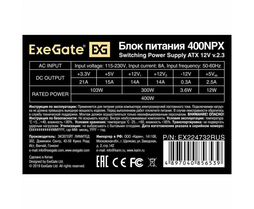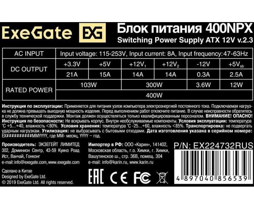 Блок питания EXEGATE Блок питания 400NPX, 400Вт, 120мм, черный [ex224732rus]
