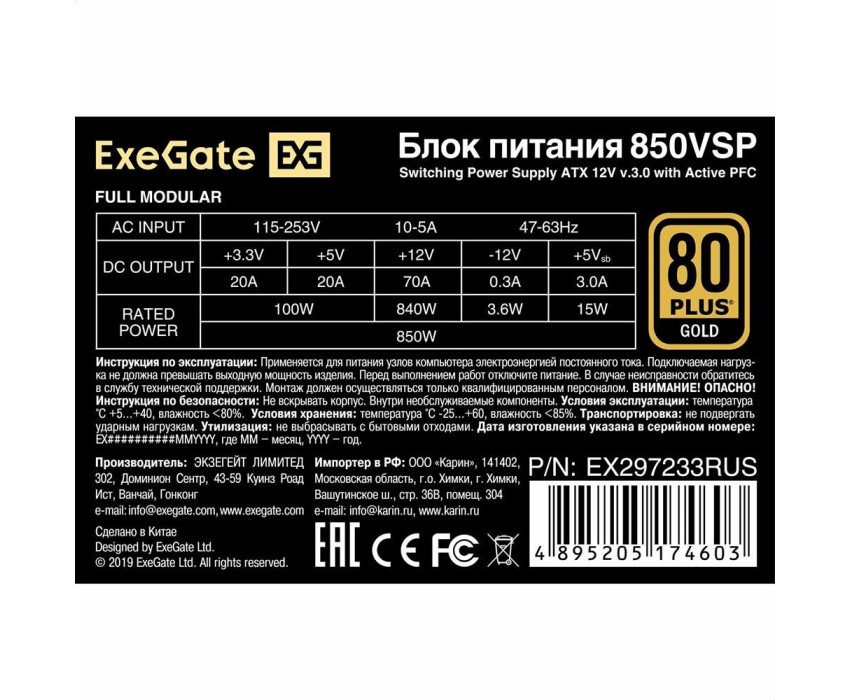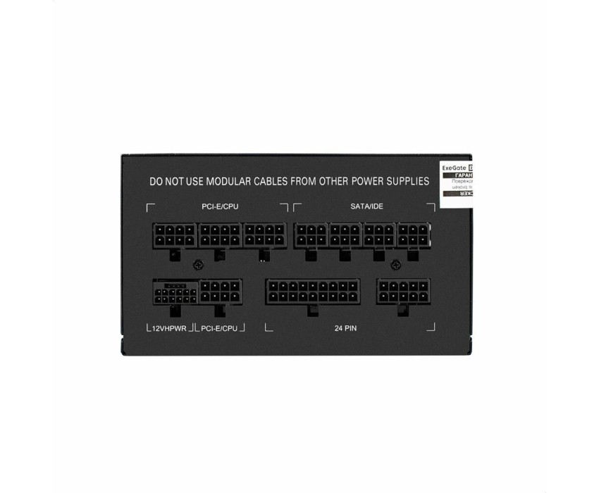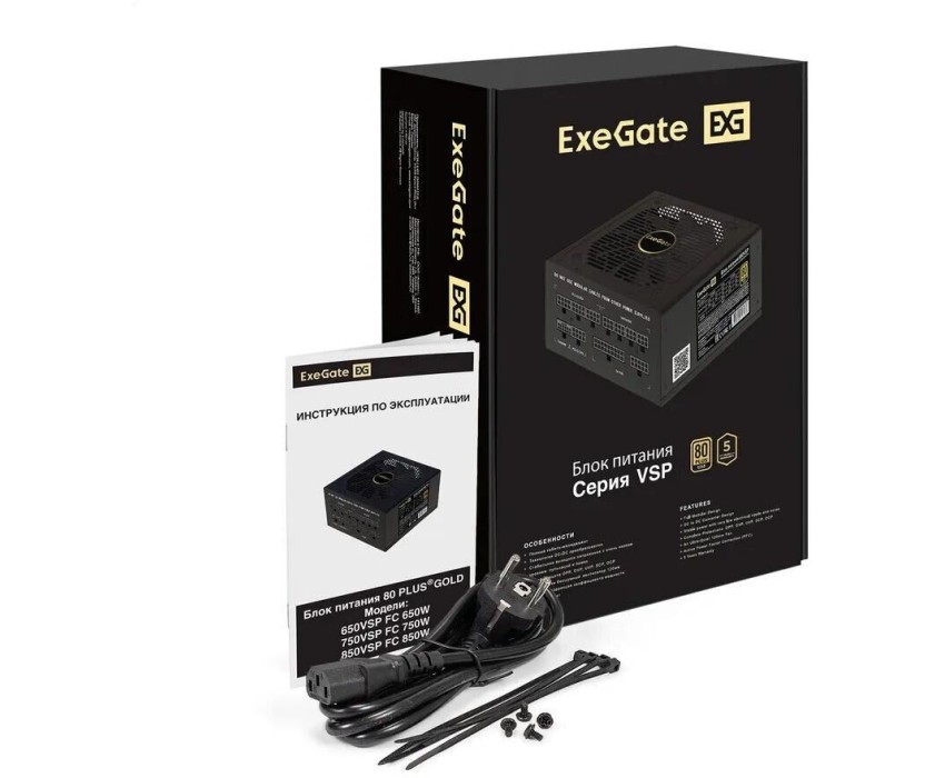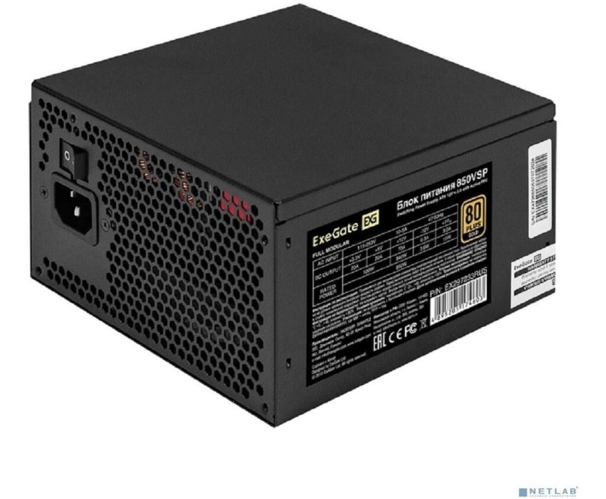 Блок питания Exegate EX297233RUS Блок питания 850W 80 PLUS® GOLD 850VSP FC (ATX3.0, APFC, КПД 90% (80 PLUS GOLD), 120mm fan, 24pin, 2x(4+4)pin, PCIE5.0/12VHPWR, 4xPCI-E, 6xSATA, 3xIDE, 1xFDD, Full Cable Management