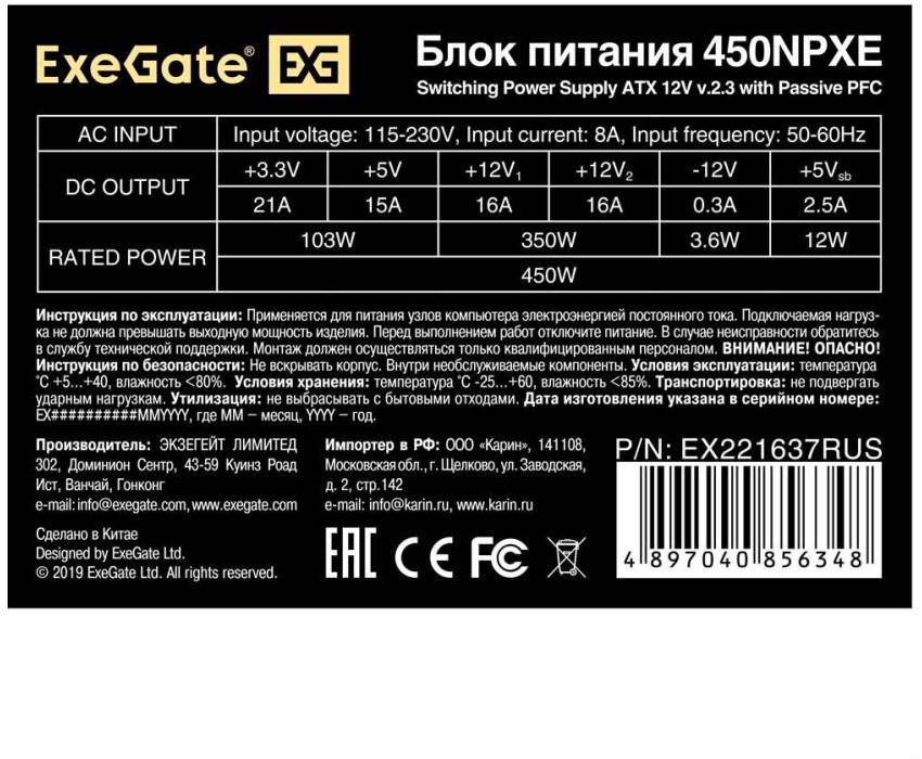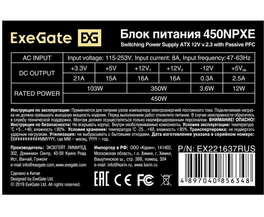Блок питания EXEGATE Блок питания 450NPXE, 450Вт, 120мм, черный [ex221637rus-pc]