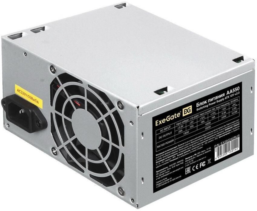 Блок питания 550W ExeGate AA550 (ATX, SC, 8cm fan, 24pin, 4pin, 2xSATA, IDE, кабель 220V с защитой от выдергивания)