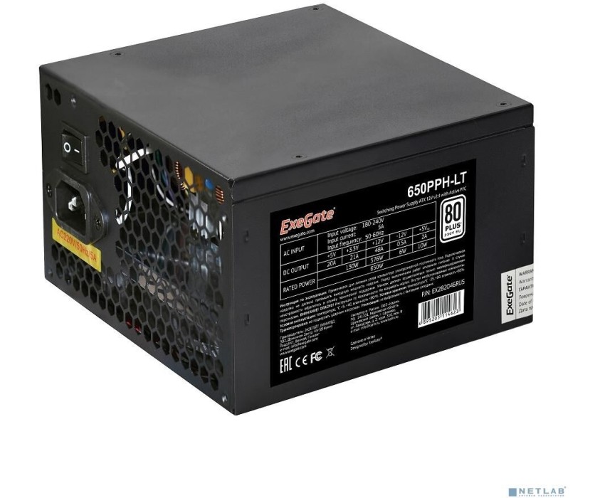 [Блок питания] Exegate EX282046RUS Блок питания 650W Exegate 650PPH-LT, RTL, 80+, ATX, black, APFC, 12cm, 24p, (4+4)p, 5*SATA, 3*IDE