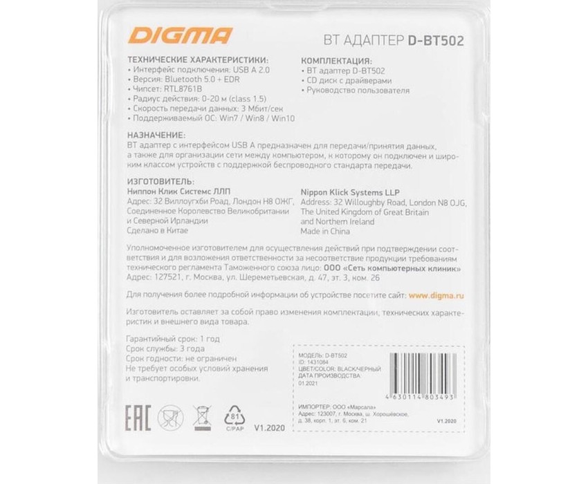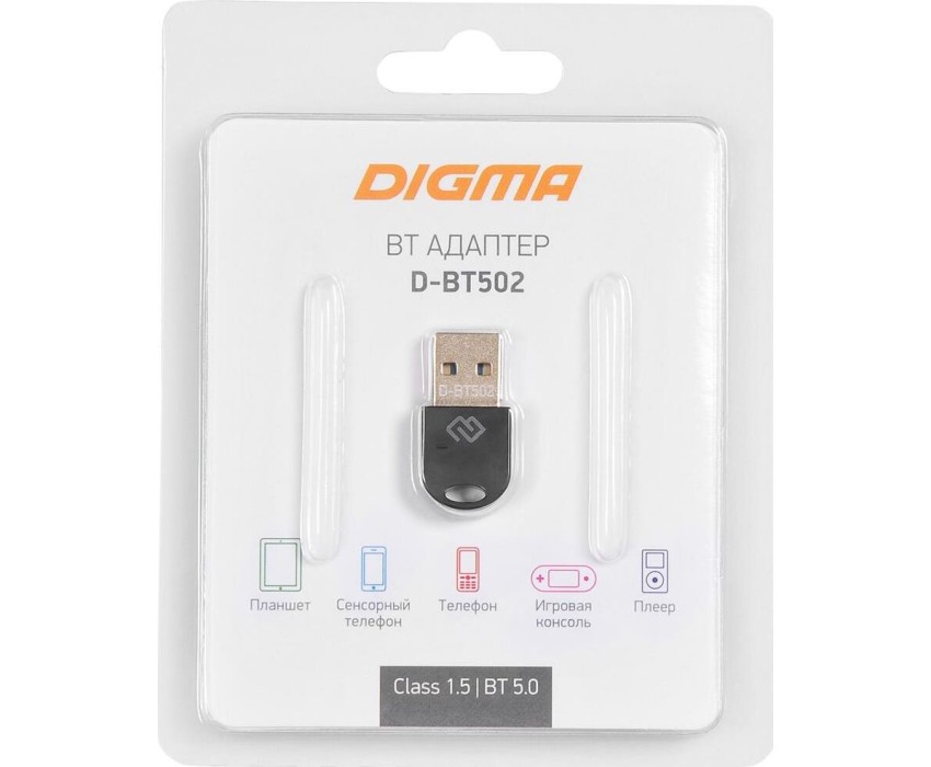 DIGMA Bluetooth адаптер D-BT502 BT 5.0+EDR class 1.5, USB, 20м, черный