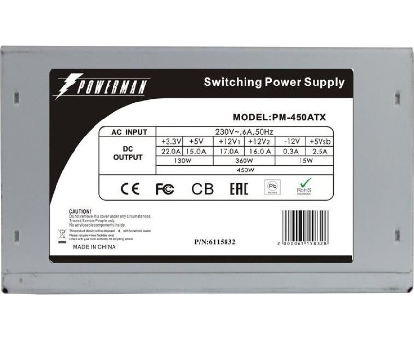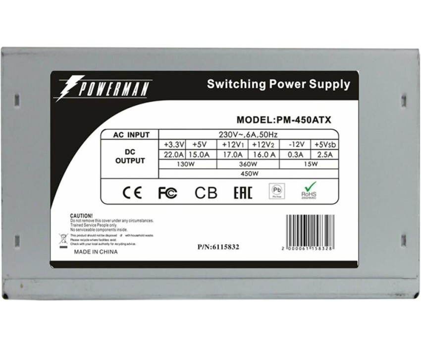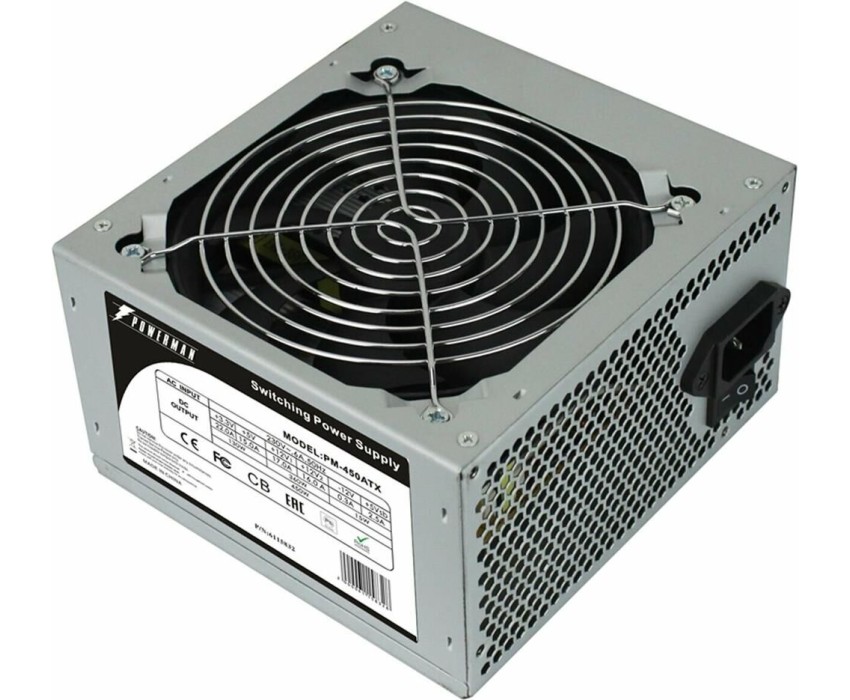 Блок питания Powerman модель PM-450ATX Форм-фактор, версия ATX 12V v2.2 / PS2 Вентилятор 120мм Коррекция коэффициента мощности - без PFC Мощность 450 Вт Защиты: OPP (Over Power Protection) – защита от перегрузки по мощности OCP (Over Current Protection) – защита от перегрузки по току. SCP (Short Circuit Protection) – защита от короткого замыкания. Входное напряжение ~230V Выходной ток по напряжению +12V1 (A) 17 Выходной ток по напряжению +12V2 (A) 16 Выходной ток по напряжению +5V (A)