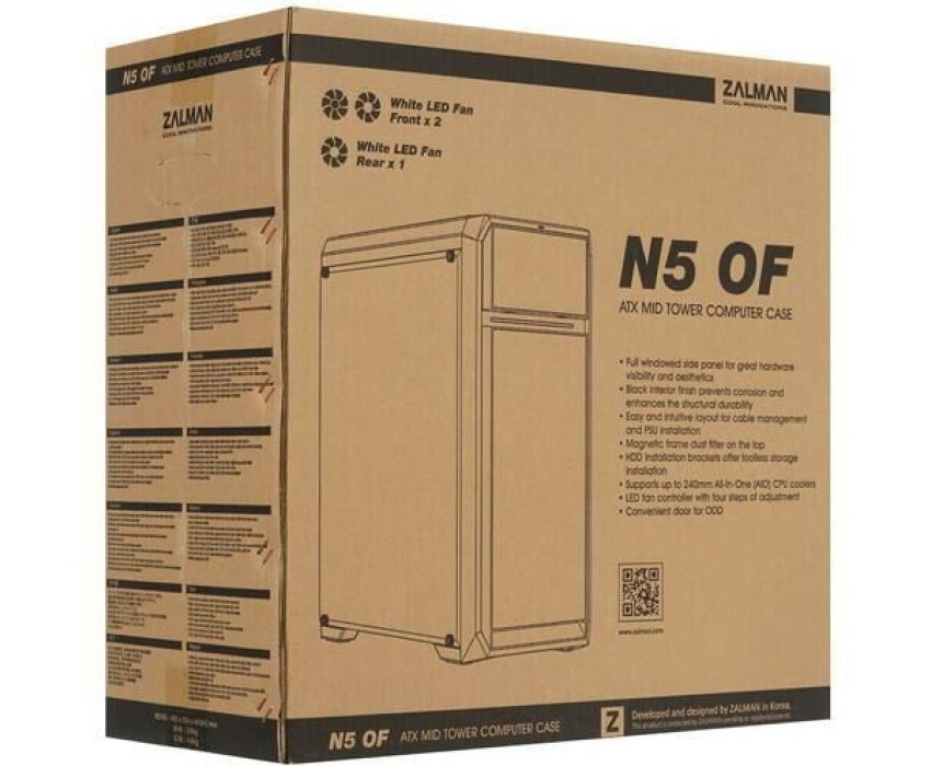 Корпус ZALMAN N5 OF обращает на себя внимание оригинальной конструкцией передней панели и обилием перфорированных элементов. Боковую стенку занимает окно из устойчивого к внешним воздействиям оргстекла. Модель имеет эффектную белую подсветку. Цвет корпуса традиционный – черный. Корпус ZALMAN N5 OF соответствует типоразмеру Midi-Tower. Совместимые материнские платы – Micro-ATX, Mini-ITX и Standard-ATX. Несмотря на относительную компактность (корпус имеет габаритные размеры 437x200x450 мм)