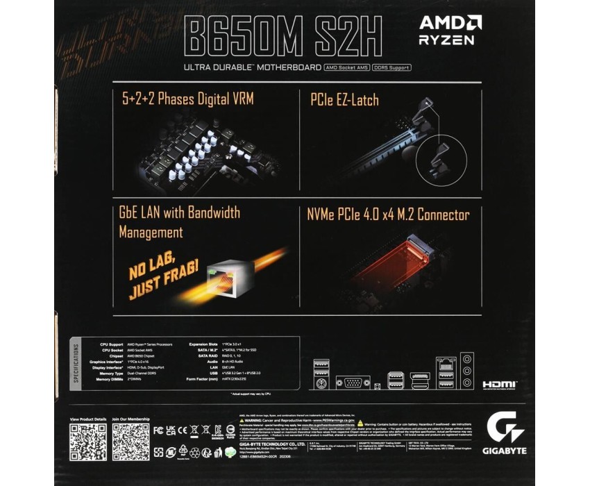 Материнская плата Gigabyte B650M S2H {SocketAM5, AMD B650, mATX, Ret}