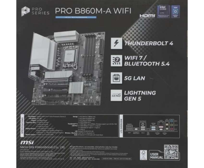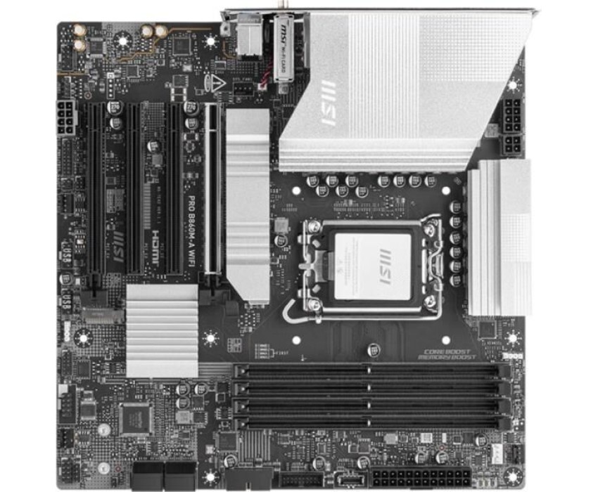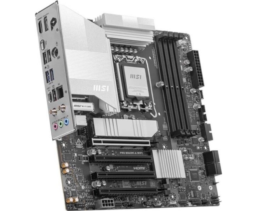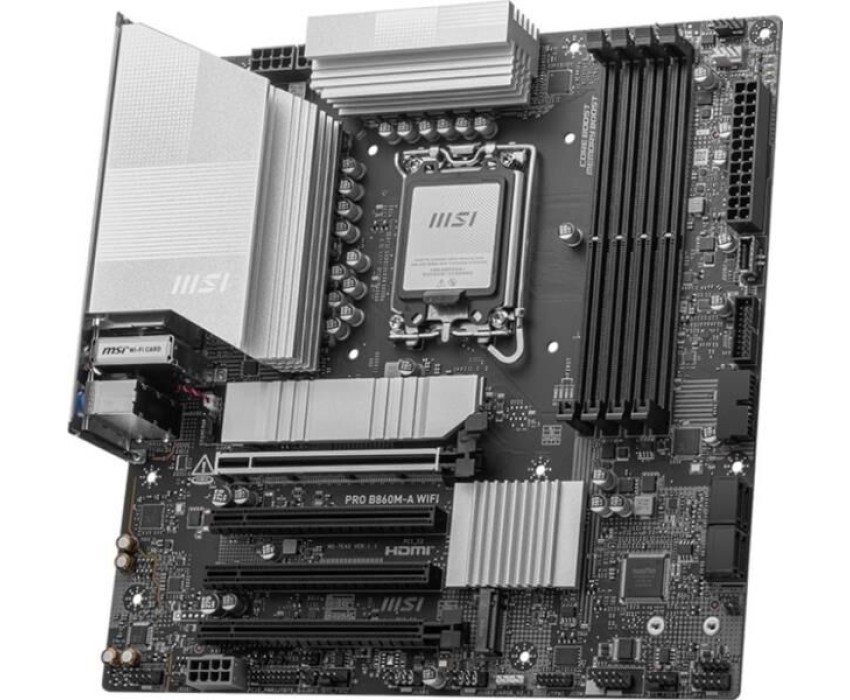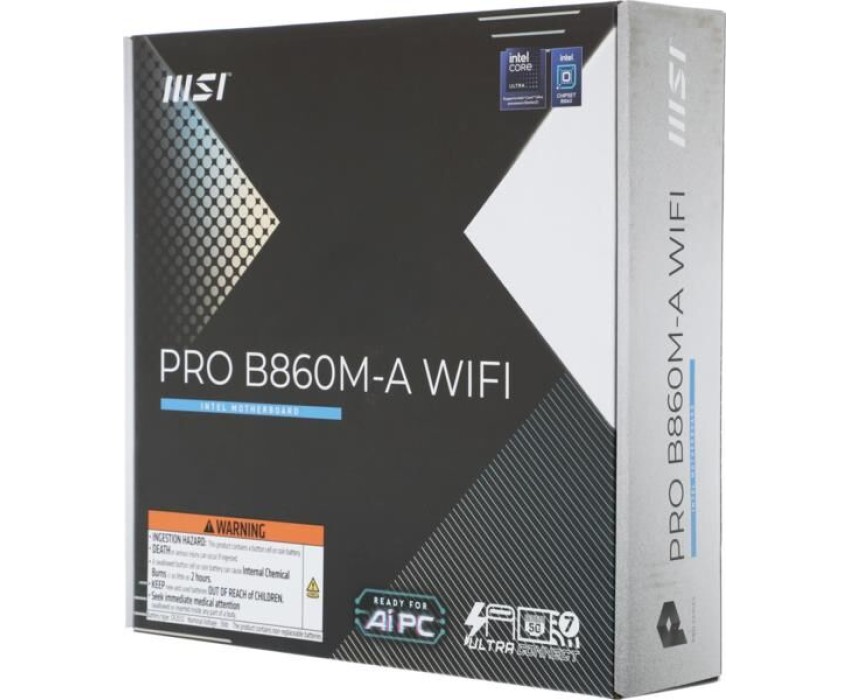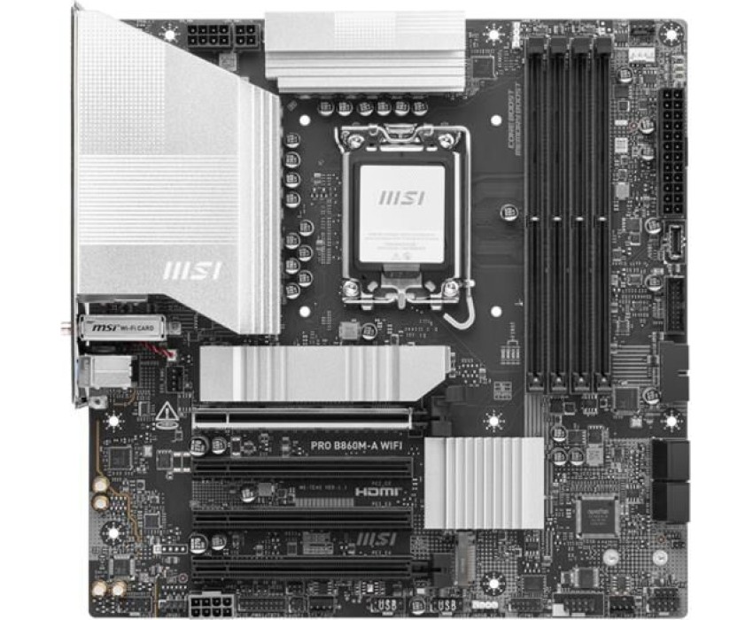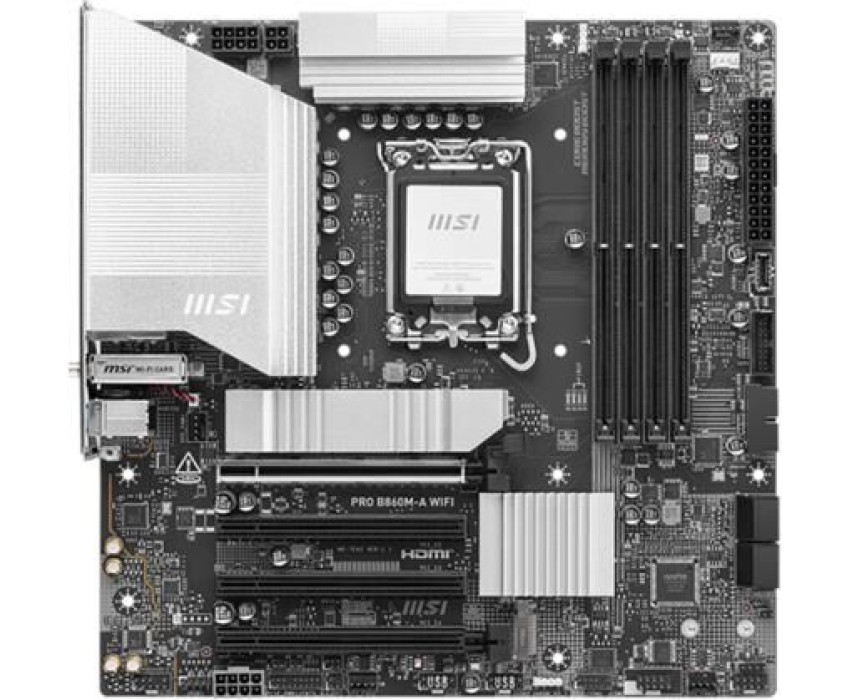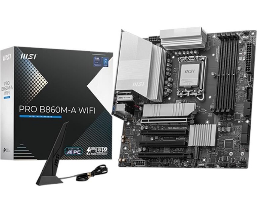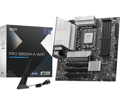 Материнская плата MSI PRO B860M-A WIFI B860, LGA1851, 4*DDR5, 4*PCIEx16, 3*M.2, 2*TypeC, 3*USB3.2Gen2, 6*USB3.2Gen1, 2*USB2.0, 4*SATA3.0, 5G, Type-C(DP), DP, HDMI, M-ATX, RTL
