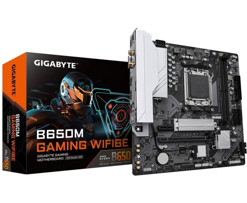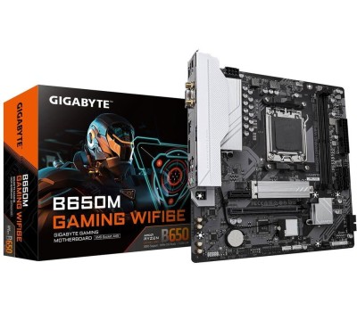 **Материнская плата Gigabyte B650M GAMING WIFI6E** — это надёжное и функциональное решение для игровых систем и рабочих станций. **Основные характеристики:** * Форм-фактор: Micro-ATX. * Чипсет: AMD B650. * Поддержка процессоров: AMD Ryzen (AM5). * Слоты для памяти: 4 DIMM, поддержка до 128 ГБ DDR5. * Слоты для видеокарт: 1 PCIe 4.0 x16. * Разъёмы для хранения данных: 2 разъёма M.2, 4 порта SATA. * Сетевые возможности: Wi-Fi 6E, Bluetooth 5.3, гигабитный Ethernet. * Аудио: аудиокодек Realtek ALC887, поддержка HD Audio. **Преимущества:** * **Поддержка последних технологий:** Wi-Fi 6E обеспечивает высокую скорость и надёжность беспроводного подключения, а поддержка PCIe 4.0 гарантирует быструю передачу данных. * **Расширенные возможности для хранения данных:** два разъёма M.2 позволяют использовать высокоскоростные NVMe SSD-накопители, а четыре порта SATA обеспечивают подключение дополнительных устройств хранения. * **Качественный звук:** аудиокодек Realtek ALC887 обеспечивает высокое качество звука для более погружённого игрового опыта. Материнская плата Gigabyte B650M GAMING WIFI6E — отличный выбор для тех, кто хочет построить мощную и современную систему с широкими возможностями для расширения и подключения различных устройств.