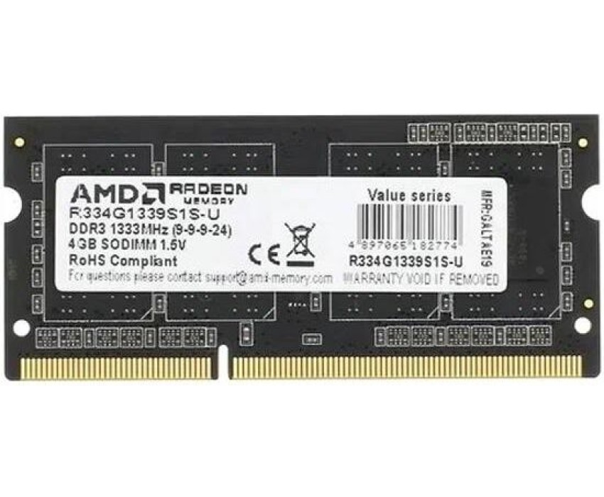 AMD RADEON Модуль памяти 4GB DDR3 1333 SO DIMM R3 Value Series Black R334G1339S1S-U Non-ECC, CL9, 1.5V, Retail R334G1339S1S-U (182774)