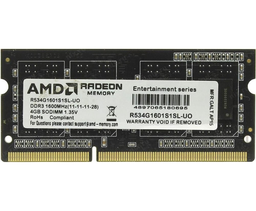 AMD RADEON Модуль памяти 4GB DDR3L 1600 SO DIMM R5 Entertainment Series Black R534G1601S1SL-UO Non-ECC, CL11, R534G1601S1SL-UO 1.35V, Bulk (180695)