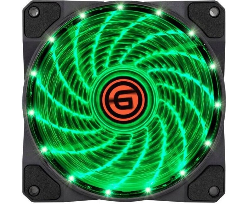 Вентилятор 12 см с LED подсветкой зеленого цвета. Количество светодиодов 15. Антивибрационные прокладки.