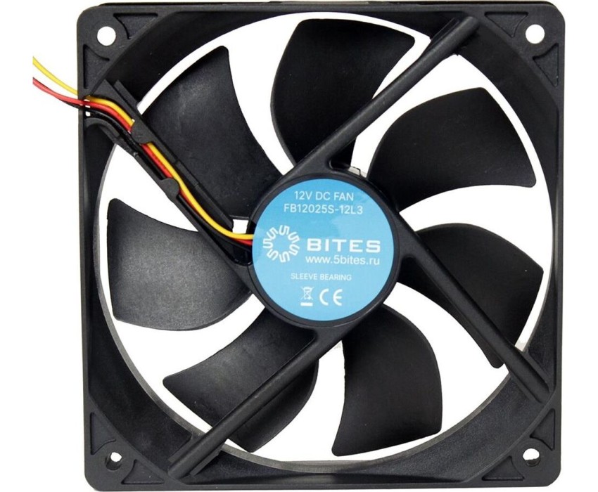 Вентилятор 12V 5BITES; Размер (мм): 120х120х25; Тип подшипника: скольжения; Скорость вращения (RPM): 1200; Уровень шума (dBa): 25; Воздушный поток (CFM): 50.05; Коннектор (pins): 3; Номинальная сила тока (А): 0.12