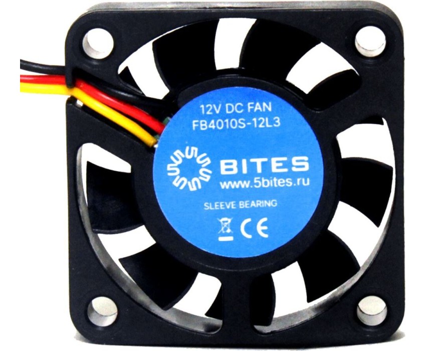 Вентилятор 12V 5BITES; Размер (мм): 40x40x10; Тип подшипника: скольжения; Коннектор (pins): 3; Скорость вращения (RPM): 5000; Уровень шума (dBa): 22; Воздушный поток (CFM): 6.58; Номинальная сила тока (А): 0.08