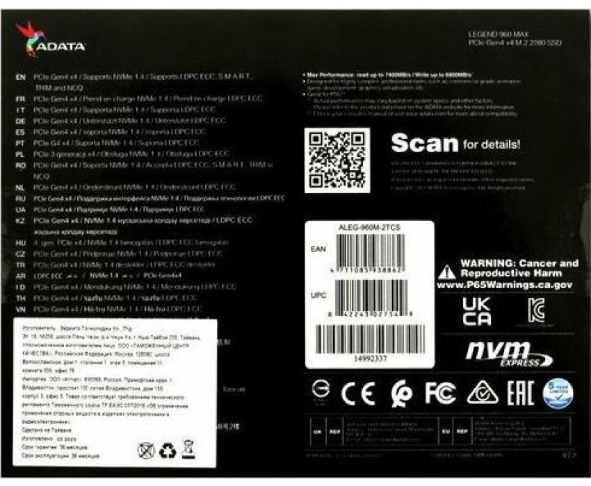 Накопитель SSD A-DATA SSD накопитель Legend 960 Max ALEG-960M-2TCS 2ТБ, M.2 2280, PCIe 4.0 x4, NVMe, M.2