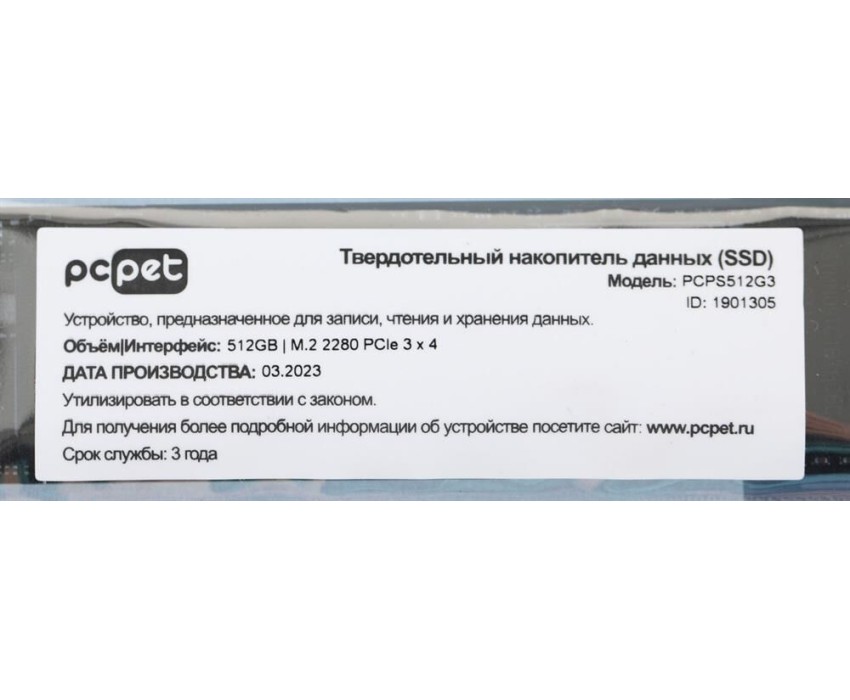 Накопитель SSD PC PET SSD накопитель PCPS512G3 512ГБ, M.2 2280, PCIe 3.0 x4, NVMe, M.2, oem