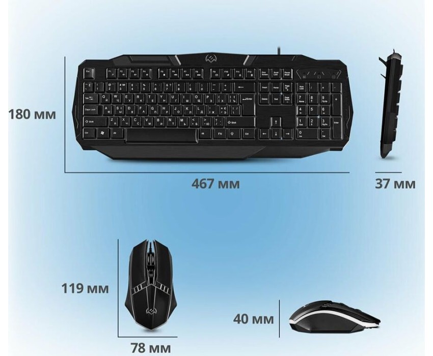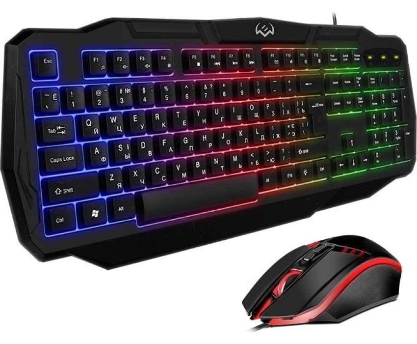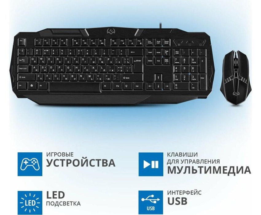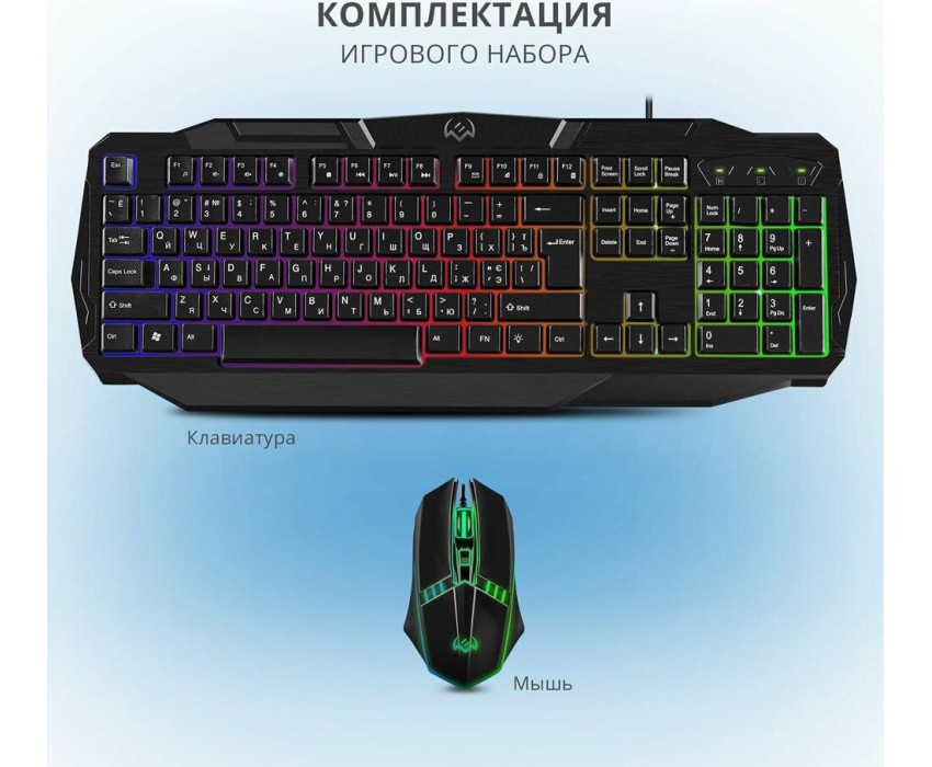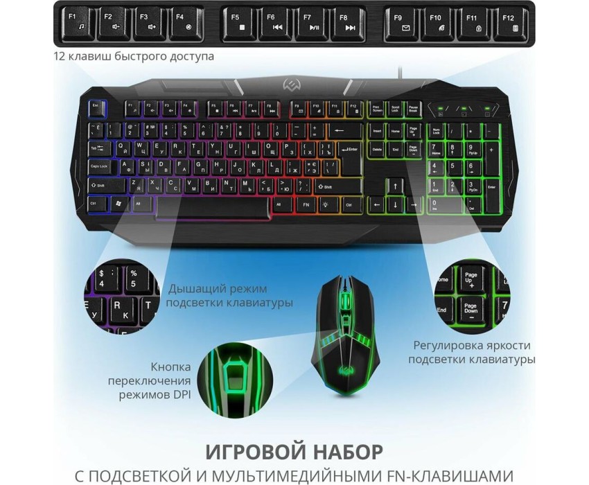 Геймерский набор (клавиатура+мышь), интерфейс USB, клавиатура -количество клавиш - 104 ,быстрого доступа - 12 шт, дышащий режим подсветки, длина кабеля -1,8 м; мышь - оптическая, проводная, количество кнопок - 3+1, изменяемое разрешение - 1000/1200/1600 dpi, динамическая подсветка корпуса.