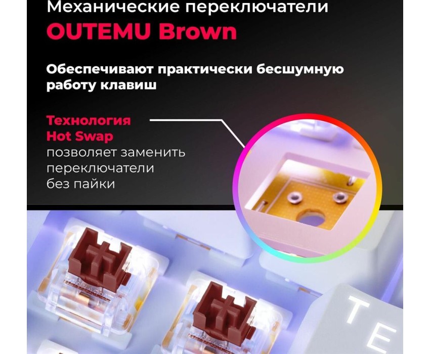 Повышенная износостойкость Позолоченный USB-коннектор - Позолоченное напыление обеспечивает лучшую проводимость, меньшее сопротивление и окисляемость Белая подсветка Технология Hot Swap Тихий ход клавиш обеспечивает практически бесшумную работу Распознает одновременное нажатие 104 клавиш