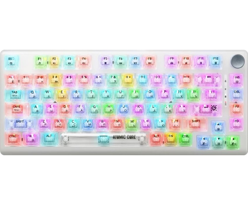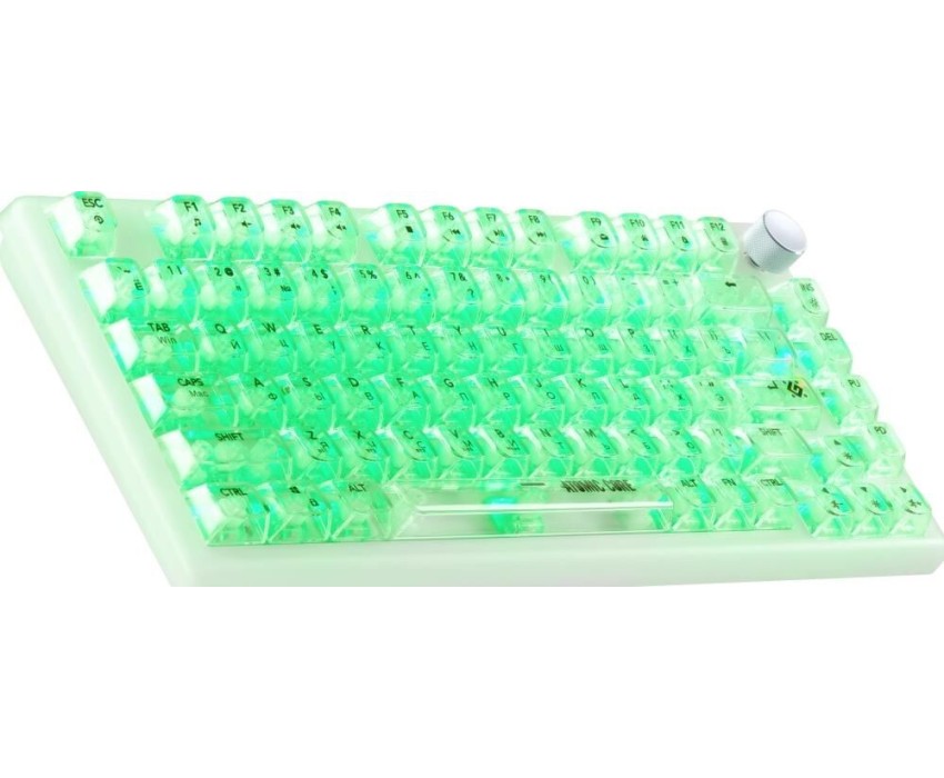 Компактная игровая механическая клавиатура на тихих переключателя SNK White, с прозрачными кейкапами и RGB подсветкой. Модель имеет 3 режима подключения: проводной, беспроводной по радио-каналу 2.4ГГц (с помощью USB-адаптера), а также подключение по Bluetooth. Также клавиатура имеет кнопку-регулятор для управления громкостью и подсветкой.