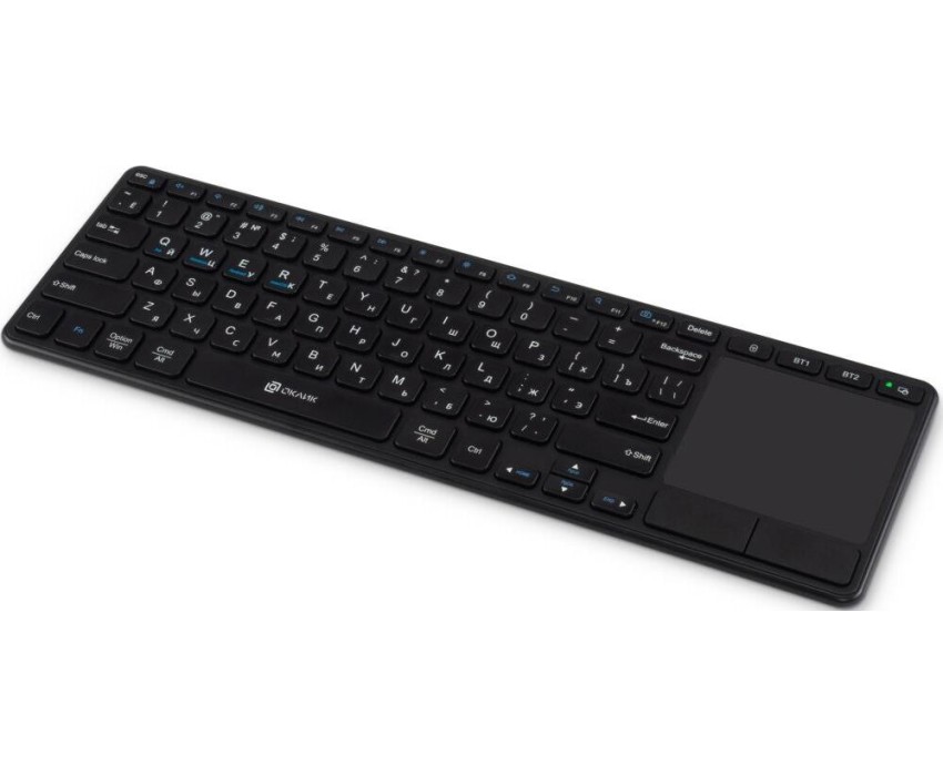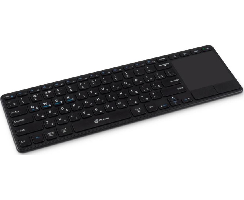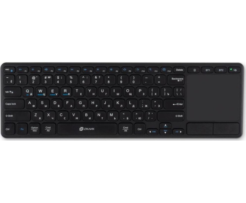 Интерфейс: USB. Тип беспроводного соединения клавиатуры: Радиоканал. Мультимедийные дополнительные клавиши: есть. Обычная/тонкая: тонкая(slim). Клавиатура с русскими буквами: ДА. Дизайн клавиш: квадратные. Панель Multi Touch: есть. Радиус действия клавиатуры: 10. Количество элементов питания: 2. Тип элементов питания: ААА. Максимальное время работы: нет. Цвет английских букв: белый. Цвет русских букв: белый. Вес: 0.51. Тип соединения: беспроводная. Количество клавиш: 85. Габариты упаковки (ед) ДхШхВ: 0.385x0.027x0.122. Вес упаковки (ед): 0.7. Гарантия: 12 мес.. Размеры клавиатуры (ШхВхТ): 370 х 15 х 117 мм. Цвет: и черный. Конструктивные особенности: сенсорная панель. Особенности клавиш: кнопки-дубли клавиши мыши. Особенности: мультимедийная, тонкая(slim). Беспроводной интерфейс: Радиоканал. Цвет русских букв: белый. Интерфейс: USB. Цвет английских букв: белый. Тип соединения: беспроводная