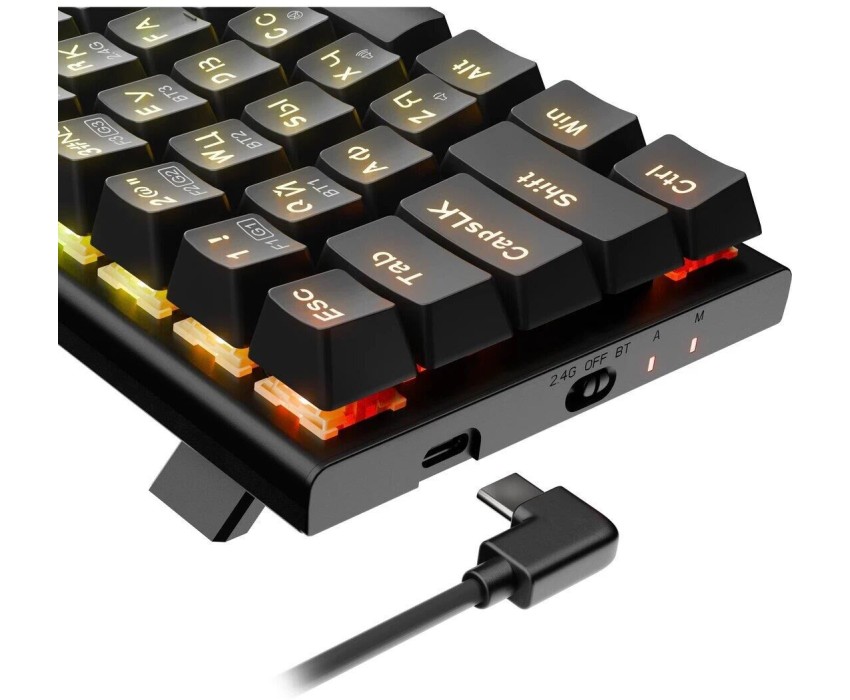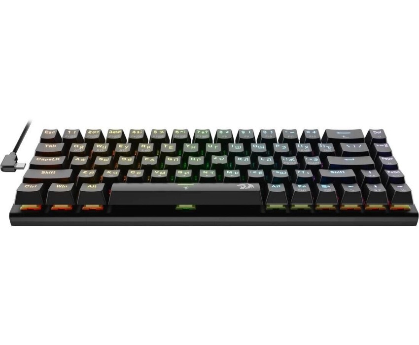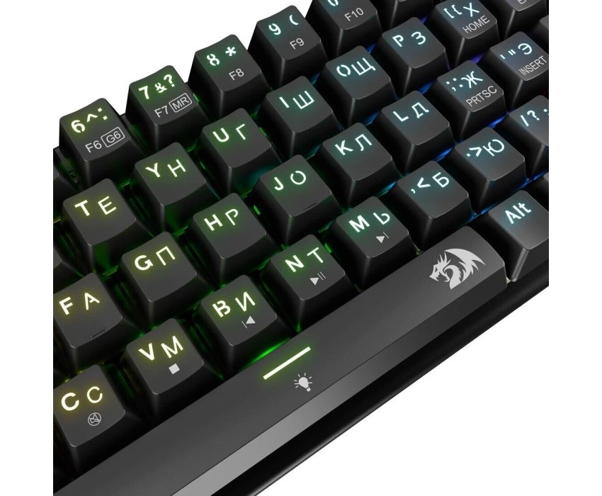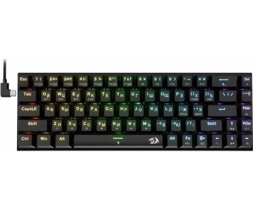 Интерфейс: USB. Тип беспроводного соединения клавиатуры: Bluetooth/Радиоканал. Мультимедийные дополнительные клавиши: есть. Для геймеров: да. Обычная/тонкая: обычная. Подсветка клавиш: есть. Клавиатура с русскими буквами: ДА. Дизайн клавиш: квадратные. Длина кабеля: 1.8. Тип элементов питания: собственный аккумулятор. Максимальное время работы: нет. Цвет английских букв: прозрачный. Цвет русских букв: прозрачный. Вес: 0.65. Механическая: да. Тип соединения: беспроводная. Количество клавиш: 68. Тип подсветки: RGB. Тип механических переключателей: Redragon Maple. Габариты упаковки (ед) ДхШхВ: 0.36x0.155x0.065. Вес упаковки (ед): 0.65. Страна производитель: Китай. Гарантия: 18 мес.. Размеры клавиатуры (ШхВхТ): 310 х 34 х 104 мм. Цвет: и черный. Беспроводной интерфейс: Bluetooth/Радиоканал. Цвет английских букв: прозрачный. Конструктив: механическая. Цвет русских букв: прозрачный. Тип соединения: беспроводная. Особенности: мультимедийная, для геймеров. Встроено: подсветка клавиш. Интерфейс: USB