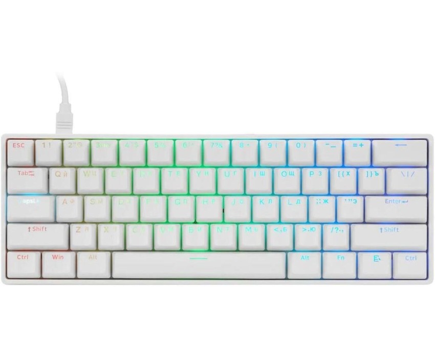Интерфейс: USB. Тип беспроводного соединения клавиатуры: Bluetooth/Радиоканал. Мультимедийные дополнительные клавиши: есть. Для геймеров: да. Обычная/тонкая: тонкая(slim). Подсветка клавиш: есть. Для ноутбуков: подходит. Клавиатура с русскими буквами: ДА. Особенности: процессор ARM Cortex-M4. Количество разъемов USB: 1xUSB TYPE-C. Дизайн клавиш: ромбовидные. Длина кабеля: 1.7. Тип элементов питания: собственный аккумулятор. Максимальное время работы: нет. Цвет английских букв: прозрачный. Цвет русских букв: прозрачный. Материал корпуса: пластик. Вес: 0.5. Механическая: да. Тип соединения: беспроводная. Количество клавиш: 61. Тип подсветки: ARGB. Габариты упаковки (ед) ДхШхВ: 0.34x0.175x0.054. Вес упаковки (ед): 0.85. Страна производитель: Китай. Время отклика: 0.12. Гарантия: 12 мес.. Цвет: и белый. Конструктив клавиатуры: компактная. Особенности клавиш: настраиваемая точка срабатывания. Цвет русских букв: прозрачный. Тип соединения: беспроводная. Особенности: мультимедийная, тонкая(slim), для ноутбуков, для геймеров. Беспроводной интерфейс: Bluetooth/Радиоканал. Конструктив: механическая. Интерфейс: USB. Встроено: подсветка клавиш. Цвет английских букв: прозрачный