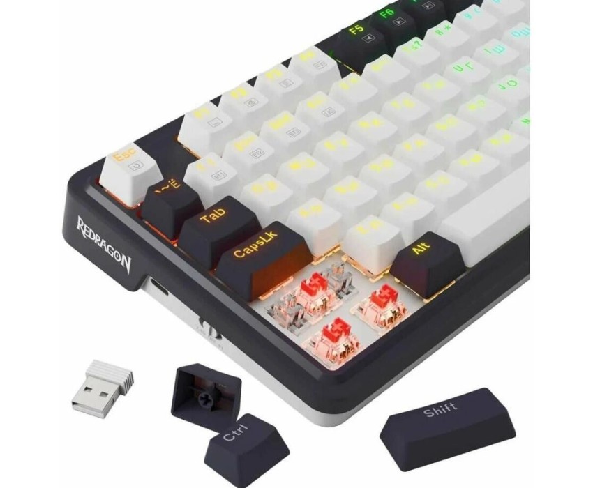 Интерфейс: USB. Тип беспроводного соединения клавиатуры: Bluetooth/Радиоканал. Мультимедийные дополнительные клавиши: есть. Для геймеров: да. Обычная/тонкая: обычная. Подсветка клавиш: есть. Для ноутбуков: подходит. Клавиатура с русскими буквами: ДА. Дизайн клавиш: квадратные. Длина кабеля: 1.8. Радиус действия клавиатуры: 10. Тип элементов питания: собственный Li-ion аккумулятор. Максимальное время работы: 19-266 часов. Цвет английских букв: прозрачный. Цвет русских букв: прозрачный. Материал корпуса: пластик. Вес: 0.92. Механическая: да. Тип соединения: беспроводная. Количество клавиш: 81. Тип подсветки: RGB. Тип механических переключателей: Redragon + red. Страна производитель: Китай. Комплектация: Клавиатура, кабель, инструкция. Гарантия: 12 мес.. Размеры клавиатуры (ШхВхТ): 335 х 37 х 140 мм. Цвет: белый, черный,черный. Конструктив клавиатуры: компактная. Конструктивные особенности: Hot Swap, шумоизоляция корпуса. Особенности клавиш: клавиша функции (Fn), управление подсветкой. Беспроводной интерфейс: Bluetooth/Радиоканал. Цвет русских букв: прозрачный. Цвет английских букв: прозрачный. Интерфейс: USB. Тип соединения: беспроводная. Конструктив: механическая. Встроено: подсветка клавиш. Особенности: мультимедийная, для ноутбуков, для геймеров
