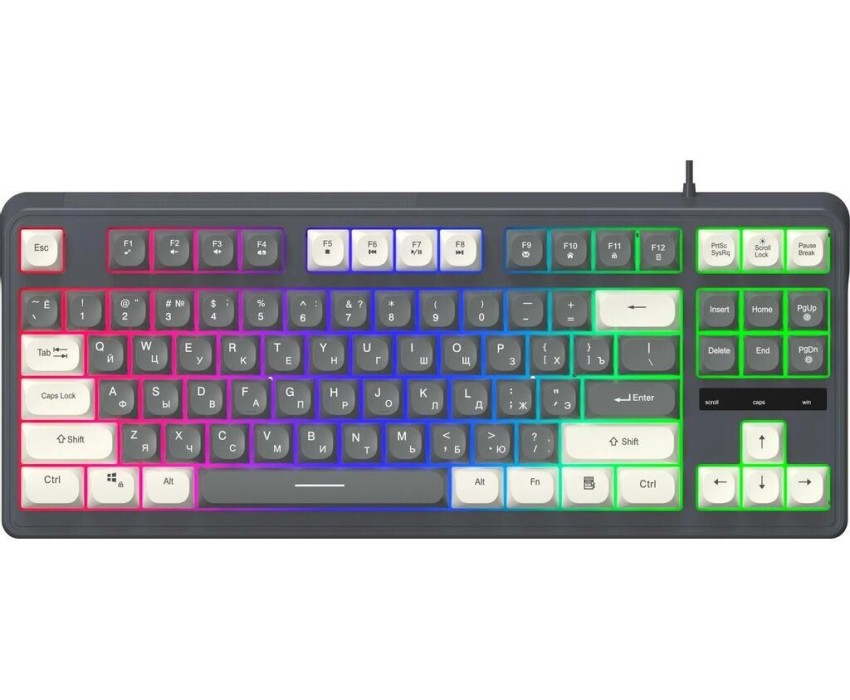 Интерфейс: USB Тип: Клавиатура Бренд: OKLICK Для геймеров: ДА Модель: 711G PartNumber/Артикул Производителя: 1790385 Тип соединения клавиатуры: проводной Цвет русских букв: белый Цвет английских букв: белый Цвет подсветки: многоцветная Клавиатура с русскими буквами: ДА Дополнительный цвет: белый Подсветка клавиш: ДА Количество клавиш: 87 Длина кабеля: 1.5 м Ширина клавиатуры: 360 мм Высота клавиатуры: 40 мм Глубина клавиатуры: 150 мм Размеры клавиатуры: 360x40x150мм Материал корпуса: пластик Вес (клавиатуры): 0.51 кг Основной цвет: серый Цвет: серый/белый Цвет клавиш: белый, серый Цвет корпуса клавиатуры: серый Дизайн клавиш: квадратные Мультимедийные дополнительные клавиши: ДА Особенности: Формат: TKL; Материал: ABS; Подсветка: многоцветная; Кабель: 1.5 м с ферритовым фильтром; Особый шарообразный дизайн клавиш; Anti-Ghosting: 19 клавиш. Особенности клавиш: интернет-клавиши Защита: от попадания жидкостей Габариты упаковки (ед) ДхШхВ: 0.39x0.18x0.045 м Вес упаковки (ед): 0.76 кг Объем упаковки (ед): 0.003159 м3 Тип механизма клавиш: мембранная Размер раскладки: 80%
