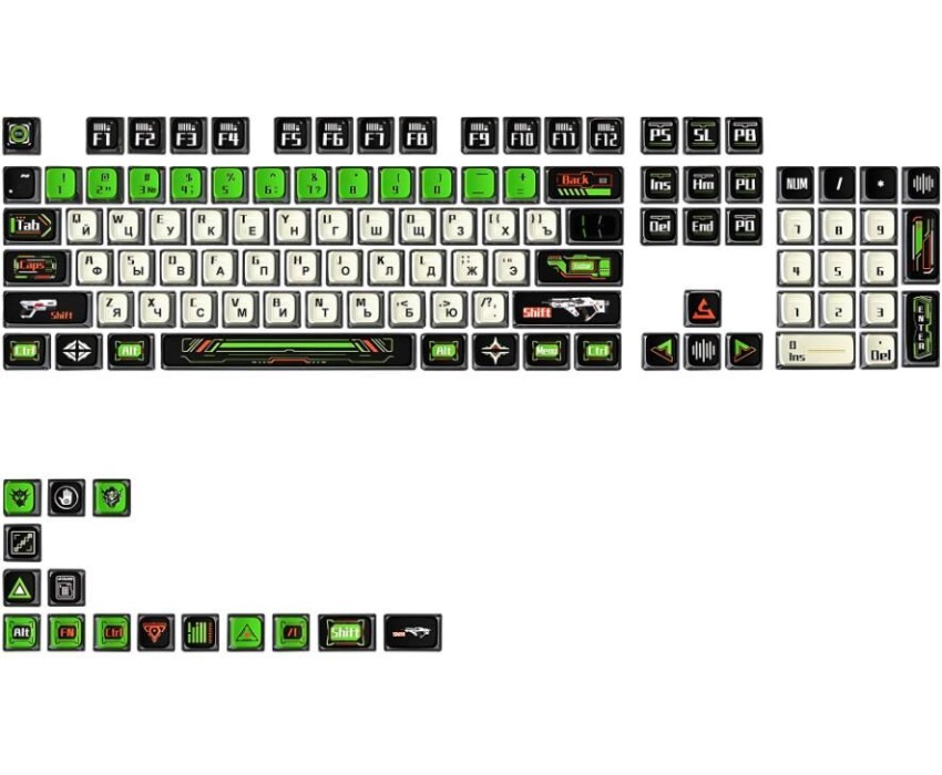 119 клавиш, материал: ПБТ+ПС, кейкапы пудинг, печать на 5 сторонах с помощью термической сублимации, совместим с клавиатурами с 61/68/75/87/98/104/108 клавиш