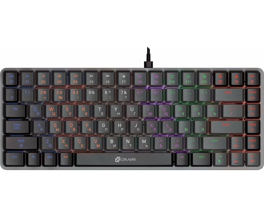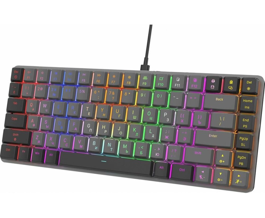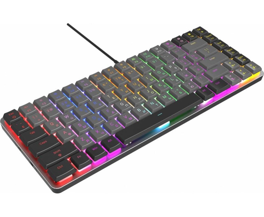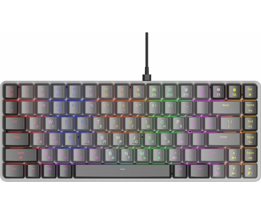 Интерфейс: USB. Мультимедийные дополнительные клавиши: есть. Для геймеров: да. Обычная/тонкая: тонкая(slim). Подсветка клавиш: есть. Клавиатура с русскими буквами: ДА. Особенности: Ресурс нажатий: до 50 000 000, короткие линейные свитчи, многоцветная LED-подсветка, выдвижные ножки, прочный алюминиевый корпус.. Дизайн клавиш: квадратные. Длина кабеля: 1.5. Максимальное время работы: нет. Цвет английских букв: многоцветный. Цвет русских букв: многоцветный. Материал корпуса: алюминий/пластик. Вес: 0.62. Механическая: да. Тип соединения: проводная. Количество клавиш: 84. Тип подсветки: многоцветная. Тип механических переключателей: GTMX Brown. Габариты упаковки (ед) ДхШхВ: 0.34x0.16x0.04. Вес упаковки (ед): 0.65. Гарантия: 12 мес.. Размеры клавиатуры (ШхВхТ): 360 х 35 х 160 мм. Цвет: и черный/серыйсерый. Интерфейс: USB. Встроено: подсветка клавиш. Цвет английских букв: многоцветный. Тип соединения: проводная. Особенности: мультимедийная, тонкая(slim), для геймеров. Конструктив: механическая. Цвет русских букв: многоцветный