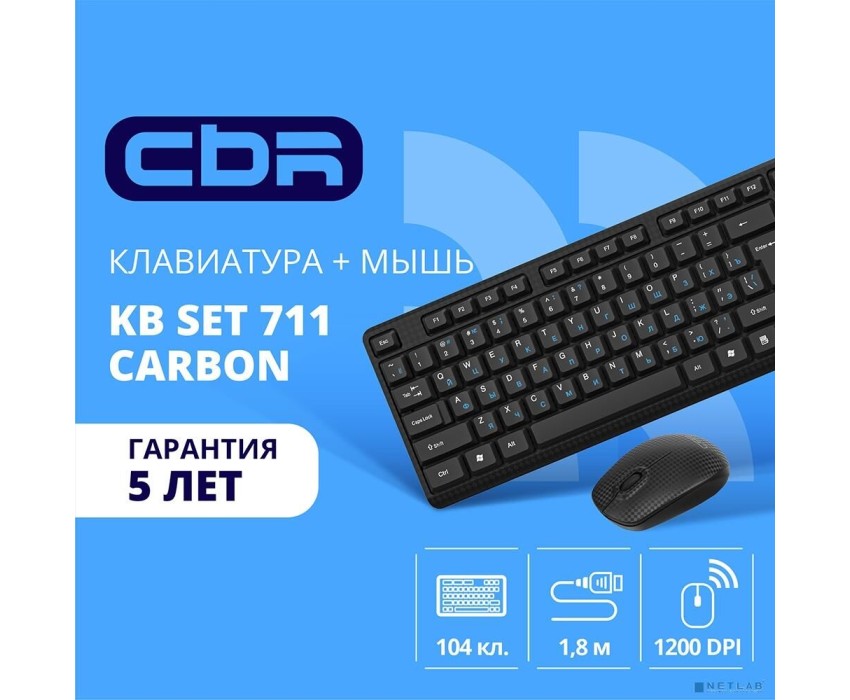 CBR KB SET 711 Carbon, Комплект (кл + м) провод., USB, поверхность "под карбон", кабель 1,8 м; кл.: полноразмерная, 104 кл.; мышь: оптич., 1200 dpi, 3 кн