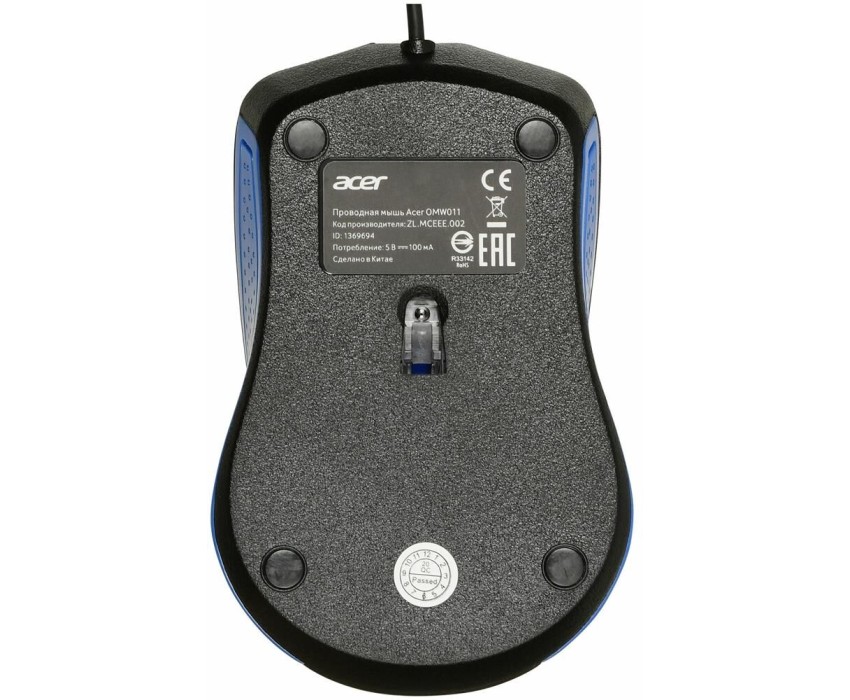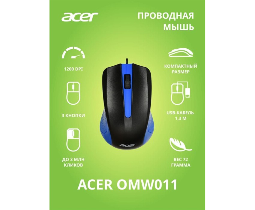 Мышь проводная Acer OMW011 ? компактное устройство для управления компьютерными действиями, которое удобно ложится в любую руку благодаря симметричному дизайну. Подключается она к компьютеру при помощи кабеля длиной 1.3 м с коннектором USB. Корпус из матового пластика меньше загрязняется, а также обеспечивает меньшее скольжение руки. Разрешение оптического датчика Acer OMW011 составляет 1200 dpi: этот показатель не изменяется. Для управления манипулятор использует стандартно 3 кнопки.