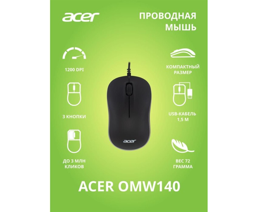 Acer OMW140: Точность и стиль в каждой детали Погрузитесь в мир безупречного контроля и элегантного дизайна с проводной оптической мышью Acer OMW140. Этот гаджет в черном корпусе предлагает идеальное сочетание функциональности и изысканности, создавая уникальный опыт работы за компьютером. Acer OMW140 оборудована высококлассным оптическим сенсором, который обеспечивает исключительную точность и плавность движений.