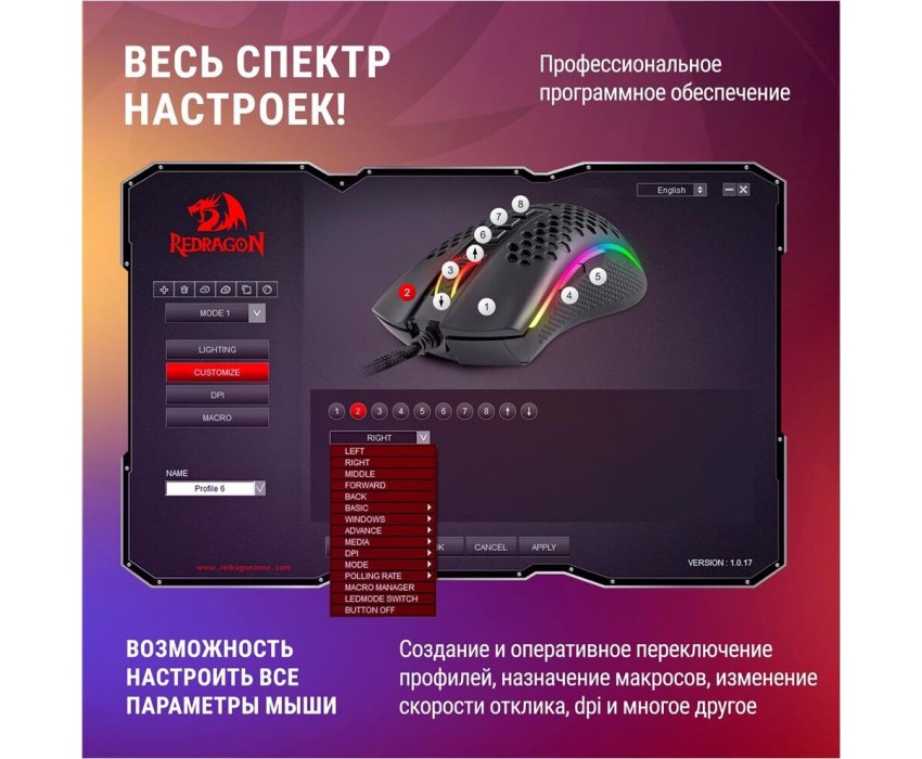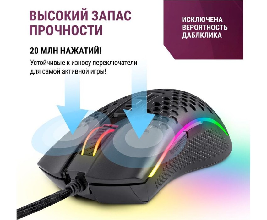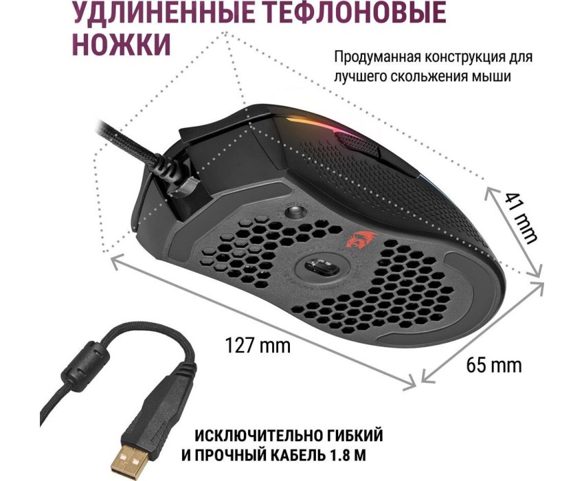 Гибкий тканевый кабель Прочные тефлоновые ножки легко скользят по поверхности стола Сохранение профилей Редактор макросов Кнопка переключения DPI Удлиненные тефлоновые ножки Уникальный запатентованный дизайн