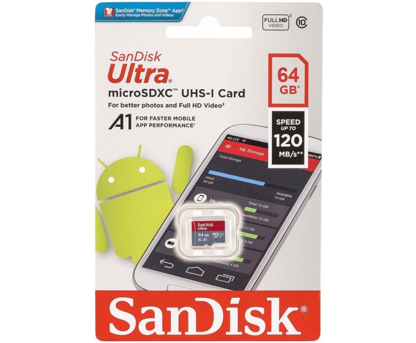 SANDISK Карта памяти microSDXC UHS-I Ultra 64 ГБ, 100 МБ/с, Class 10, SDSQUNR-064G-GN3MN, 1 шт., без адаптера
