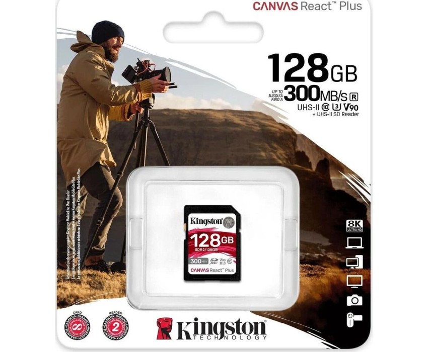 Карта памяти KINGSTON Карта памяти SDXC UHS-II U3 Canvas React Plus 128 ГБ, 300 МБ/с, Class 10, SDR2/128GB, 1 шт., без адаптера
