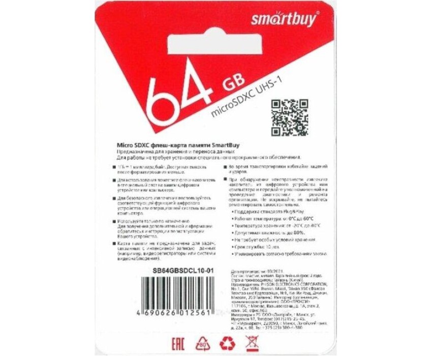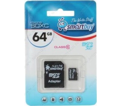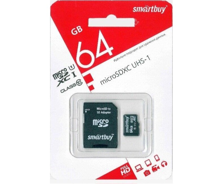 Карта памяти SMARTBUY (SB64GBSDCL10-01) MicroSDXC 64GB Class10 UHS-1 + адаптер