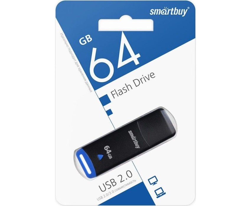 USB-накопитель, объем памяти - 64 ГБ, скорость записи данных - 20 Мб/с, скорость чтения данных - 35 Мб/с, отверстие для крепления, колпачок, материал корпуса - пластик.