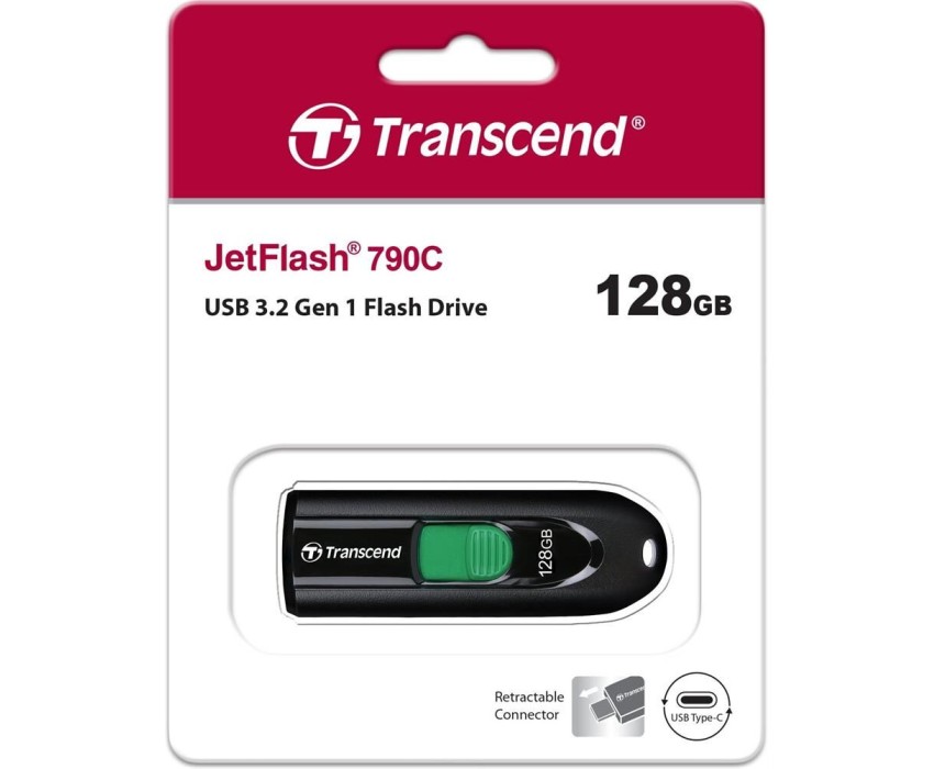 Флеш-диск TRANSCEND TS128GJF790CФлеш-диск 128GB TRANSCEND JetFlash 790C, разъем USB 3.2, черный/зеленый, TS128GJF790CФлеш-накопитель Transcend JetFlash 790C подойдёт для хранения для фотографий, видеофайлов, музыки и многого другого. Флеш-накопитель Transcend JetFlash 790C не имеет защитного колпачка, но при этом оснащен выдвигаемым разъемом USB 3.2. Благодаря интерфейсу USB 3.2 JetFlash790C позволяет максимально упростить хранение и перенос цифровых файлов.