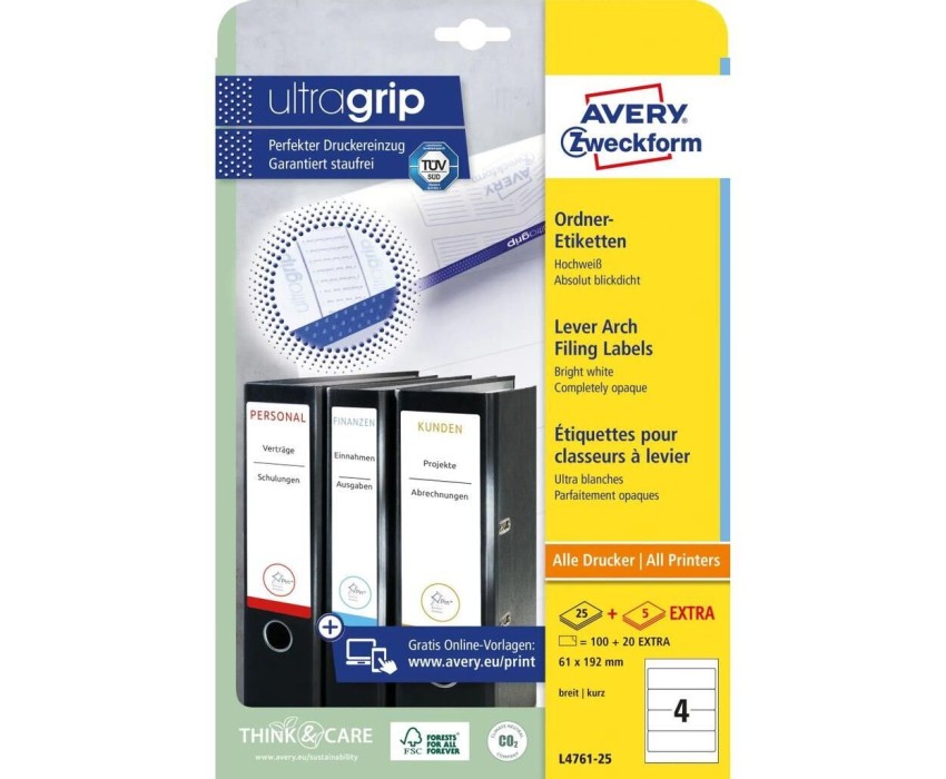 AVERY ZWECKFORM Этикетки L4761-25 A4 61x192мм 4шт на листе/80г/м2/25л./белый самоклей. универсальная