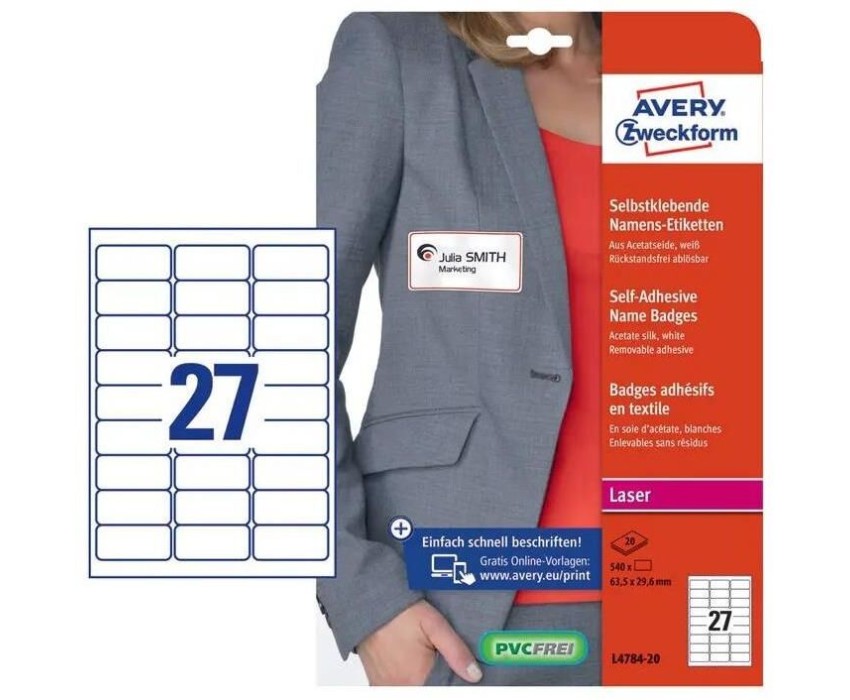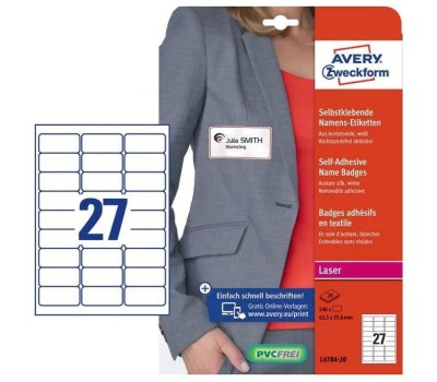 AVERY ZWECKFORM Этикетки L4784-20 29.6x63.5мм 27шт на листе/120г/м2/20л./белый ацетатный шелк самоклей. для лазерной печати