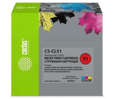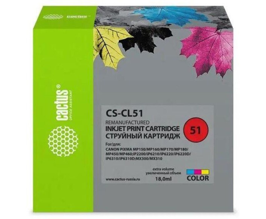 CACTUS Картридж струйный CS-CL51 CL-51 голубой/пурпурный/желтый (18мл) для Canon Pixma MP150/MP160/MP170/MP180/MP450/MP460/iP2200/iP6210/iP6220/iP6220D/iP6310/iP6310D/MX300/MX310 с чипом