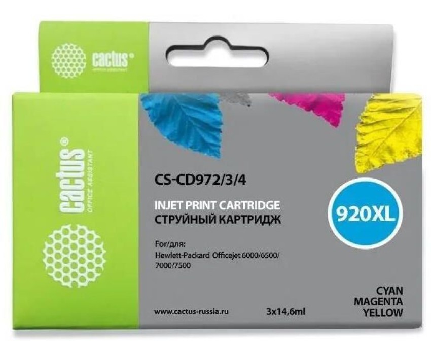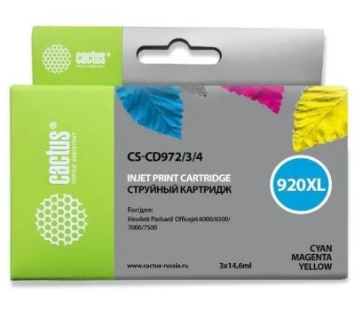 CACTUS Картридж струйный CS-CD972/3/4 №920XL голубой/желтый/пурпурный набор (43.8мл) для HP DJ 6000/6500/7000/7500 с чипом