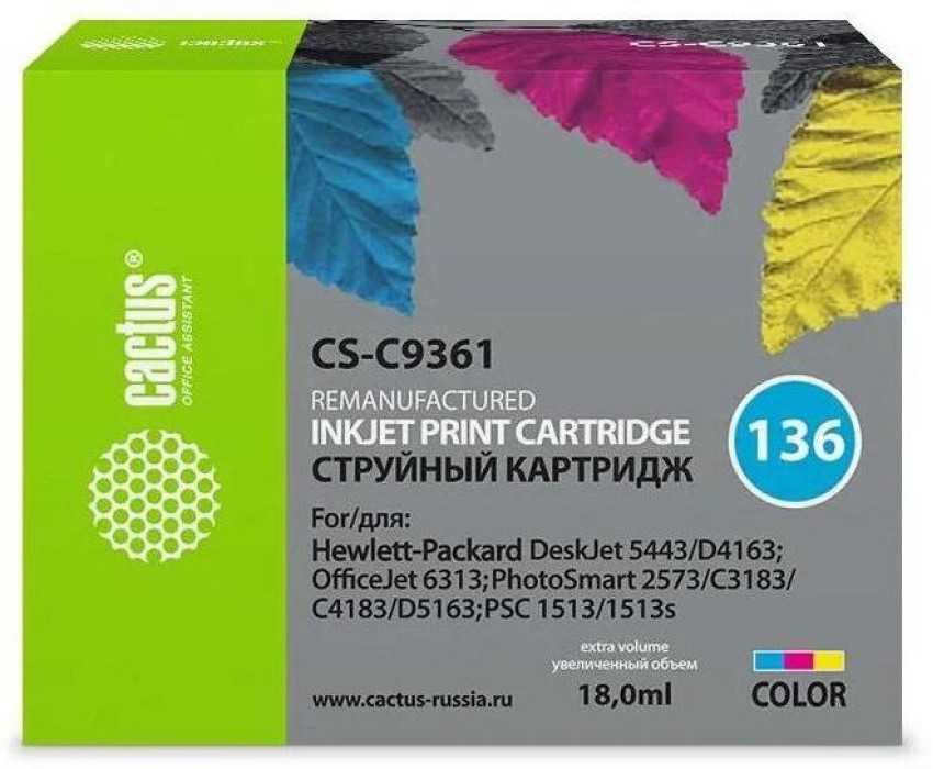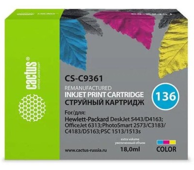 CACTUS Картридж струйный CS-C9361 №136 многоцветный (18мл) для HP DJ 5443/D4163/DJ 6313/PS 2573/C3183/C4183/D5163/1513/1513s с чипом
